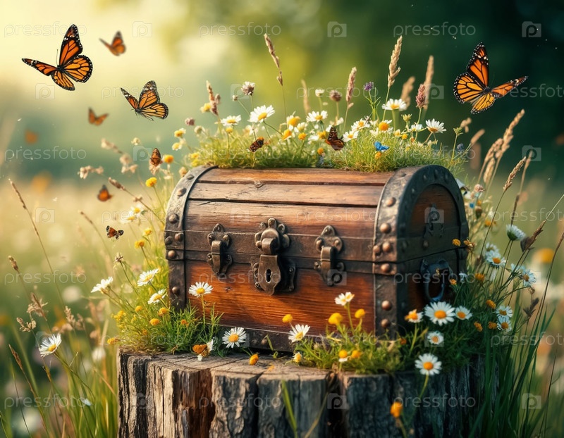 Волшебная грудь на пеньке, летние травы, цветы и бабочки, 3D-искусство