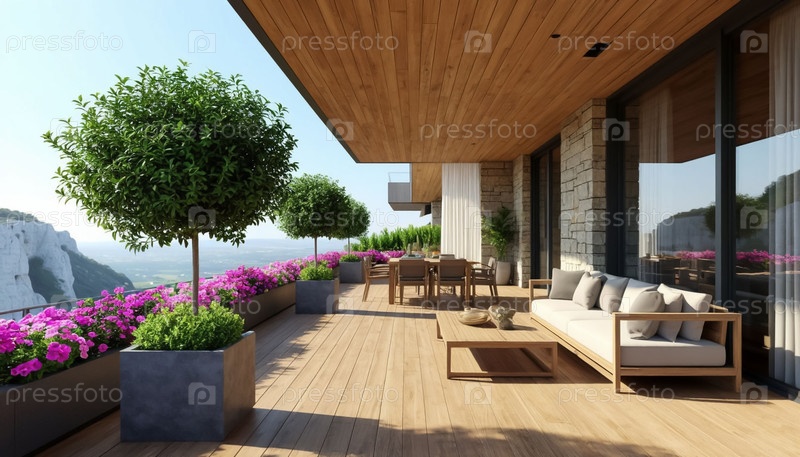 Интерьер летней террасы с обеденной зоной в горном отеле. Генерируется ИИ
