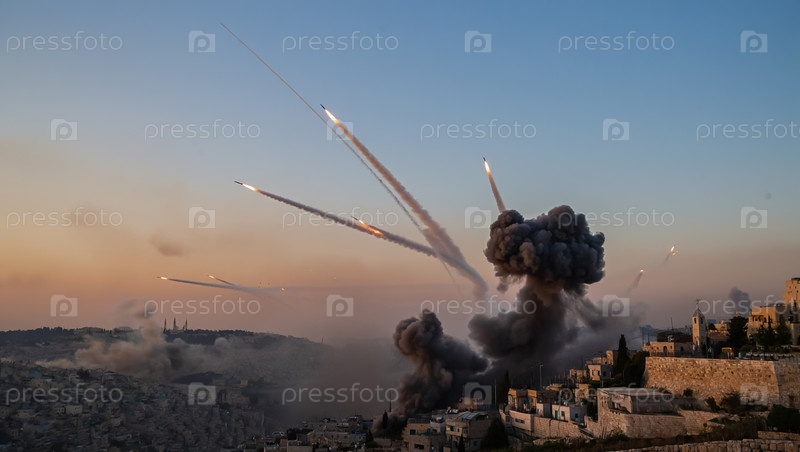Взрывы снарядов над городами Ирана и Израиля. Военный конфликт. Генерируется ИИ