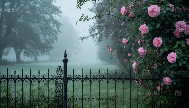 Восхождение роз на металлическом кованом заборе, саду, тумане