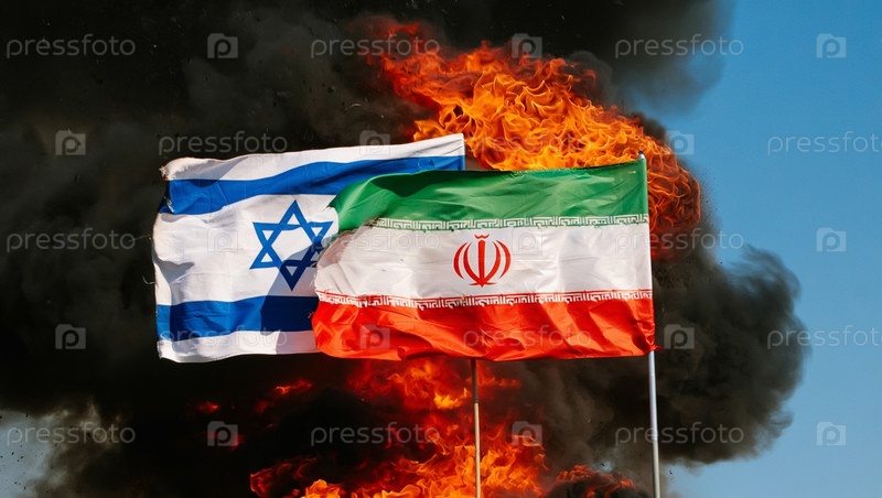 Два флага Израиля и Ирана охвачены пламенем. Военный конфликт. Угроза ядерной войны. Генерируется ИИ