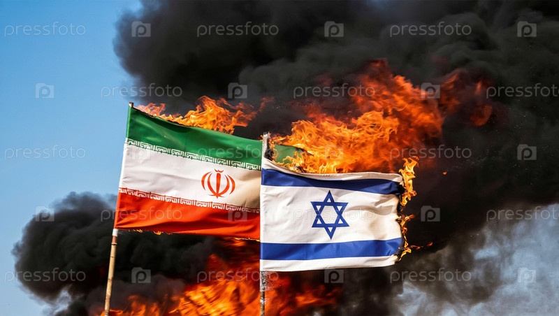 Два флага Израиля и Ирана охвачены пламенем. Военный конфликт. Угроза ядерной войны. Генерируется ИИ
