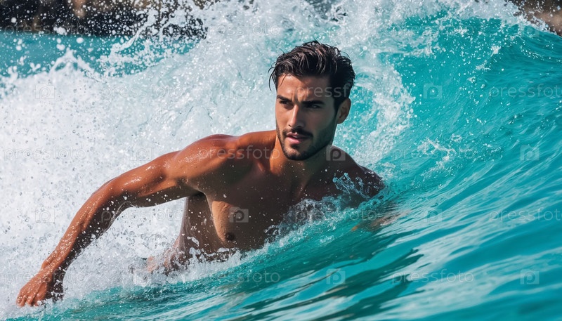 Красивый брутальный мужчина плавает в море прозрачной волной. Генерируется ИИ