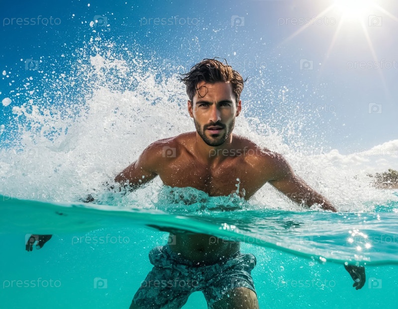 Красивый брутальный мужчина плавает в море прозрачной волной. Генерируется ИИ