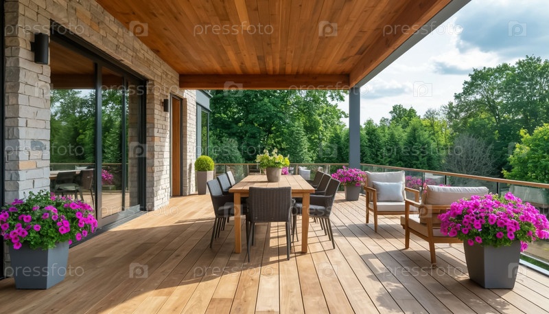 Интерьер летней террасы загородного дома с обеденной зоной, украшенной цветами. Генерируется ИИ