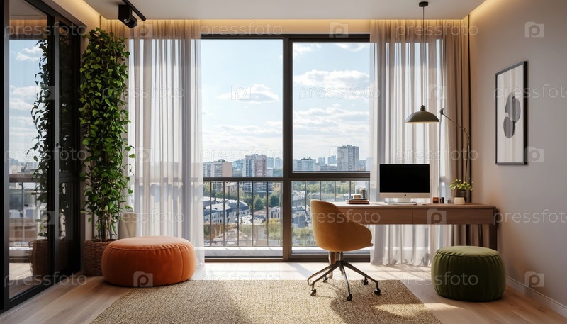 Балкон оборудован как кабинет. Уютные, панорамные окна. Генерируется ИИ