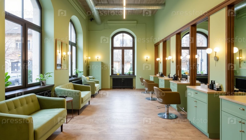 Интерьер салона красоты в пастельных фисташках и кофейных тонах. Генерируется ИИ