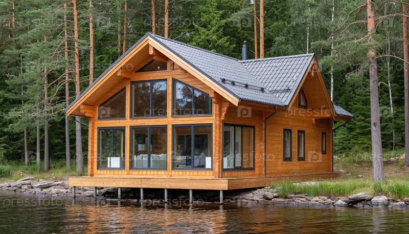 Деревянный загородный коттедж в лесу у реки. Наружный отдых. Кемпинг. Генерируется ИИ