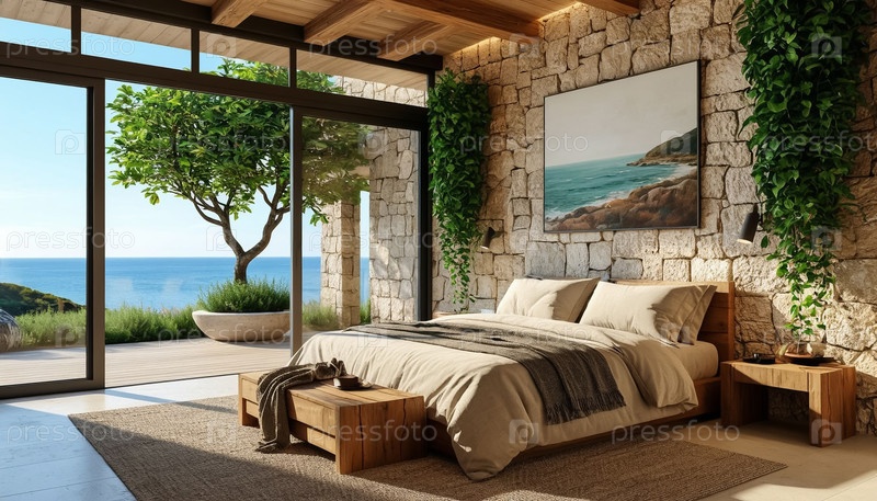 Роскошный современный гостиничный номер на берегу моря с огромными окнами и террасой. Генерируется ИИ
