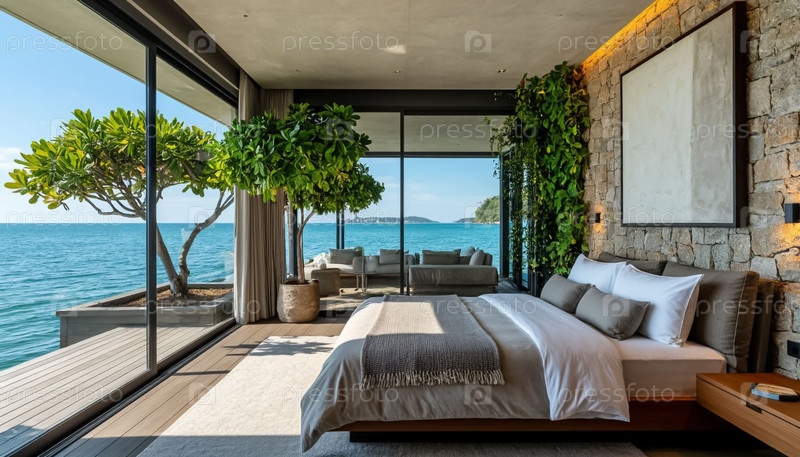 Роскошный интерьер спальни с панорамными окнами на берегу моря. Генерируется ИИ
