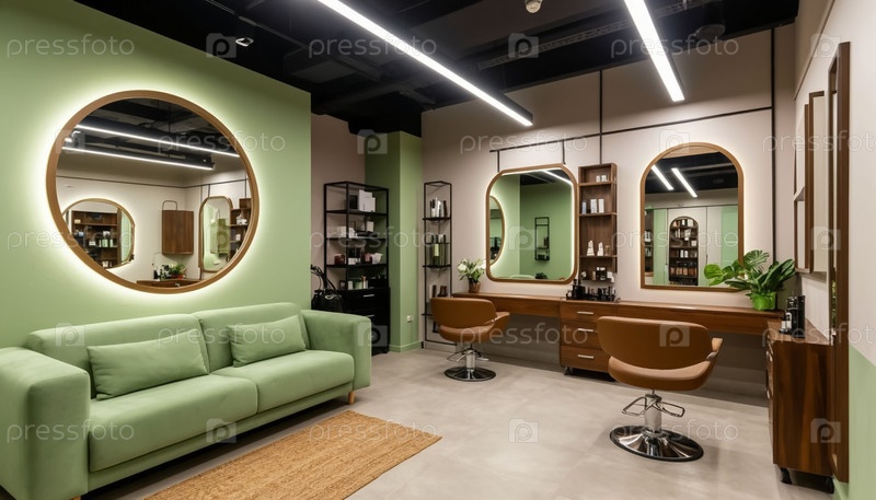 Интерьер салона красоты в пастельных фисташках и кофейных тонах. Генерируется ИИ