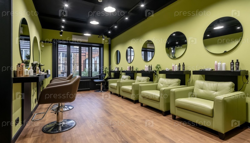 Интерьер салона красоты в пастельных фисташках и кофейных тонах. Генерируется ИИ
