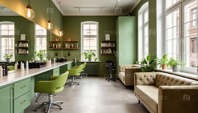 Интерьер салона красоты в пастельных фисташках и кофейных тонах. Генерируется ИИ