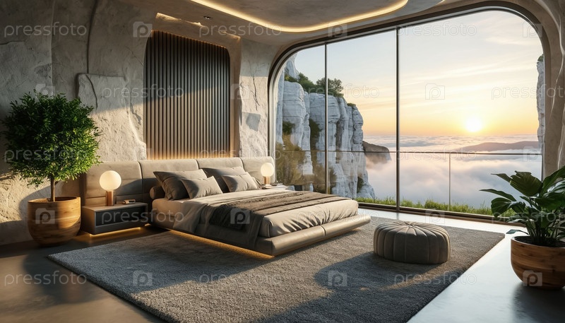 Высокотехнологичный интерьер спальни с панорамными окнами и видом на горы. Сгенерированный ИИ