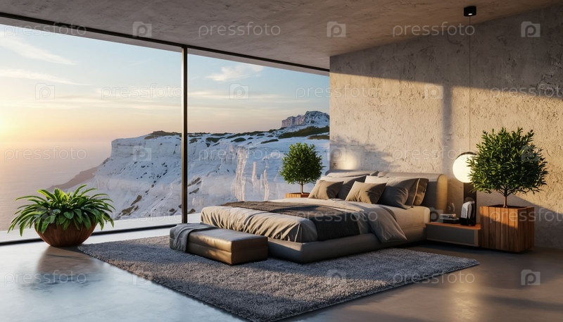 Высокотехнологичный интерьер спальни с панорамными окнами и видом на горы. Сгенерированный ИИ