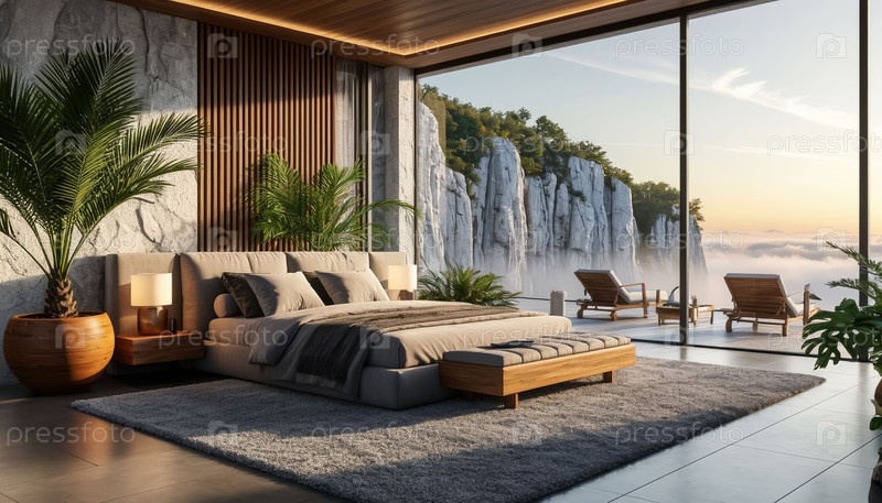 Высокотехнологичный интерьер спальни с панорамными окнами и видом на горы. Сгенерированный ИИ