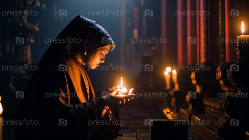 Монахиня в храме молится при свечах. Сгенерированный ИИ