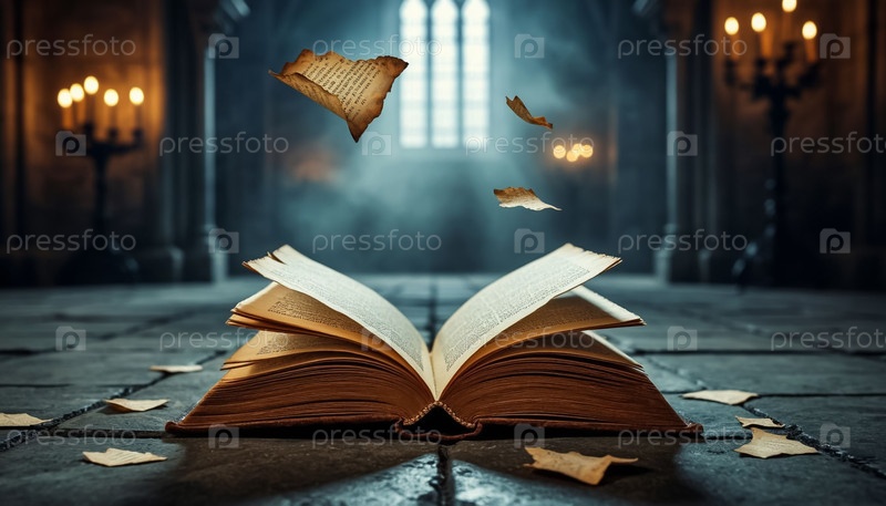 Старая книга в готическом храме на полу. Сгенерированный ИИ