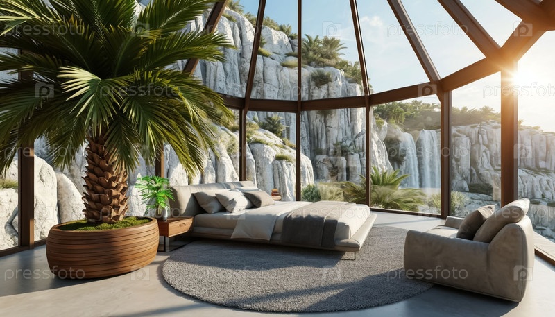 Интерьер спальни в высокотехнологичном стиле с панорамными окнами и видом на горы. Отдых в загородном отеле. Генерируется ИИ