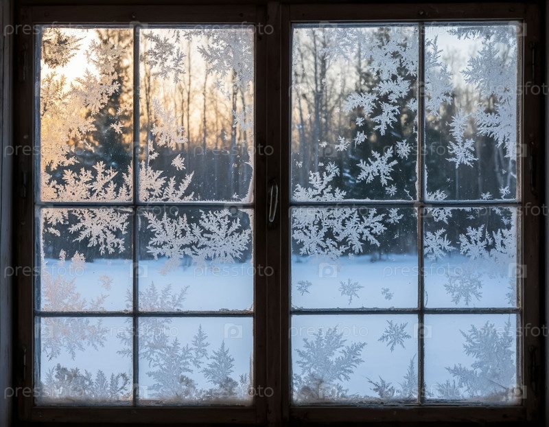 Морозный узор на окнах деревенского дома. Генерируется ИИ