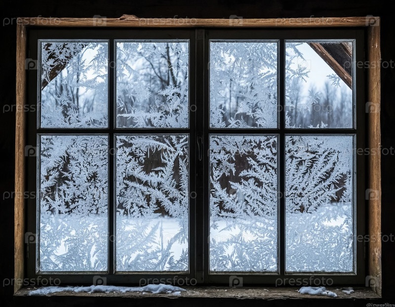 Морозный узор на окнах деревенского дома. Генерируется ИИ