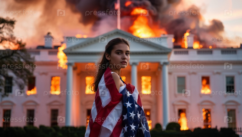 Девушка с американским флагом на фоне горящего Белого дома Генерируется ИИ