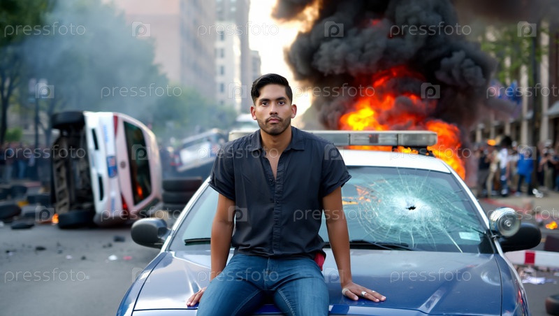 Латиноамериканец перед горящей полицейской машиной. Беспорядки в Калифорнии и Техасе. Сгенерированный ИИ