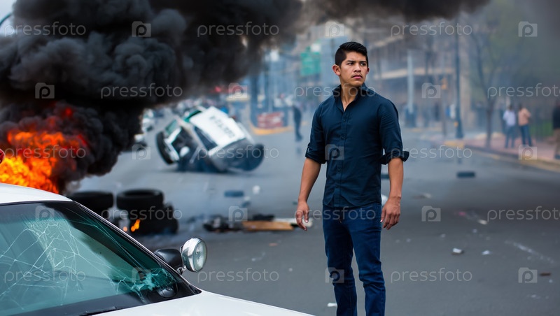 Латиноамериканец перед горящей полицейской машиной. Беспорядки в Калифорнии и Техасе. Сгенерированный ИИ