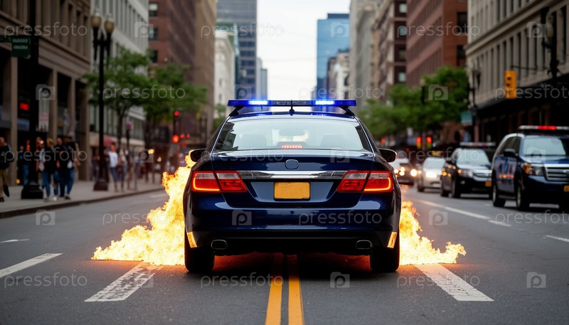 Беспорядки на улицах американского города, полицейская машина горит. Генерируется ИИ