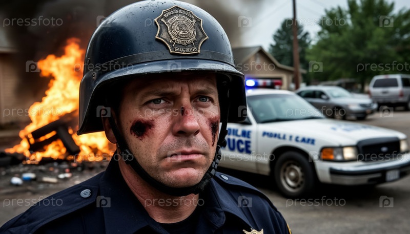 Американский полицейский с горящими шинами в городе. Сгенерированный ИИ