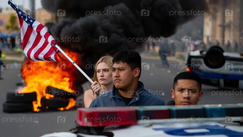 Латинос и белая девушка с американским флагом перед горящей полицейской машиной. Беспорядки в Калифорнии и Техасе. Генерируется ИИ