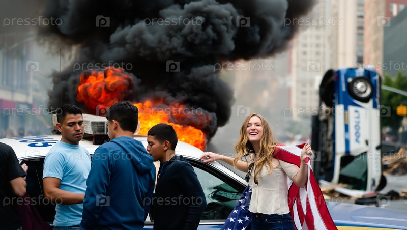 Латинос и белая девушка с американским флагом перед горящей полицейской машиной. Беспорядки в Калифорнии и Техасе. Генерируется ИИ