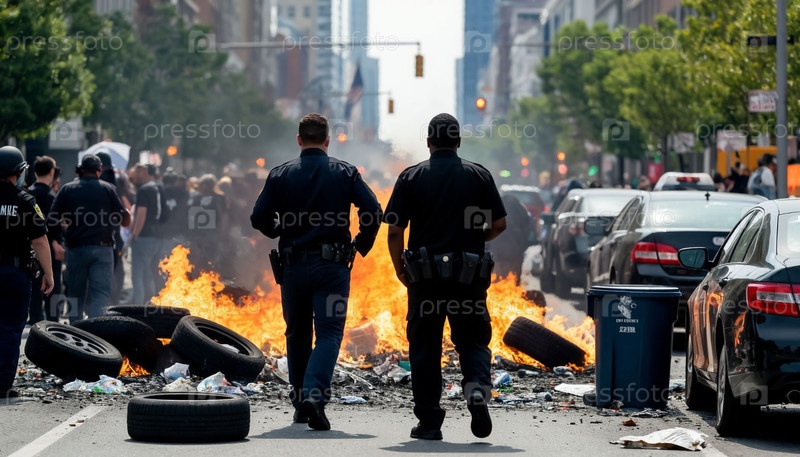 Беспорядки на улицах американского города. Калифорния, Лос-Анджелес. Генерируется ИИ