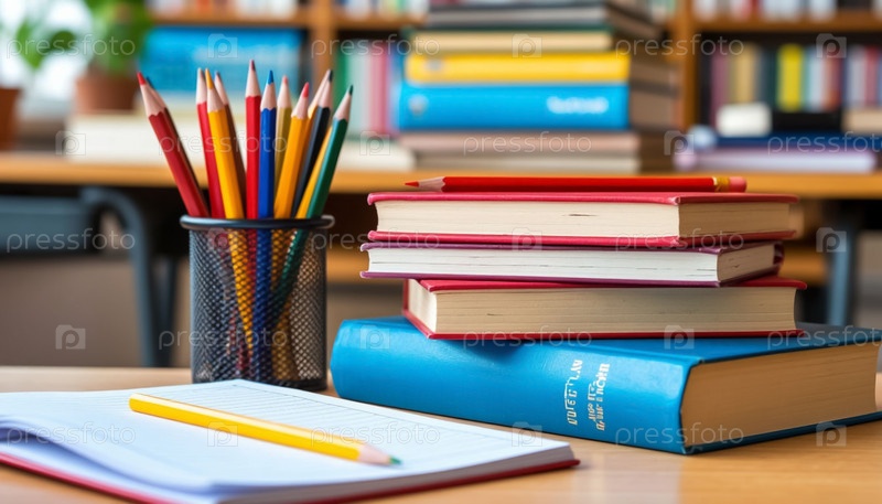 Стол школьника в классе с учебниками и карандашами в школе. Генерируется ИИ