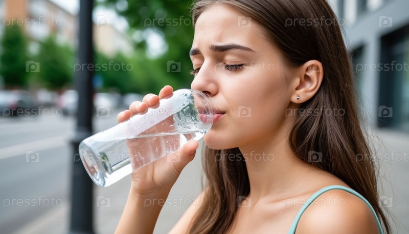 Девушка летом пьет воду в городе. Сгенерированный ИИ