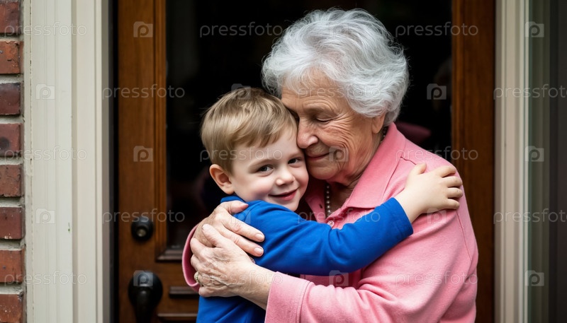 Бабушка обнимает внука на пороге. Сгенерированный ИИ