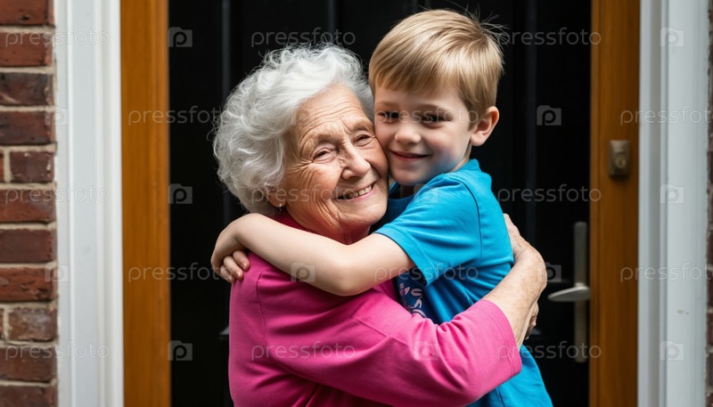 Бабушка обнимает внука на пороге. Сгенерированный ИИ