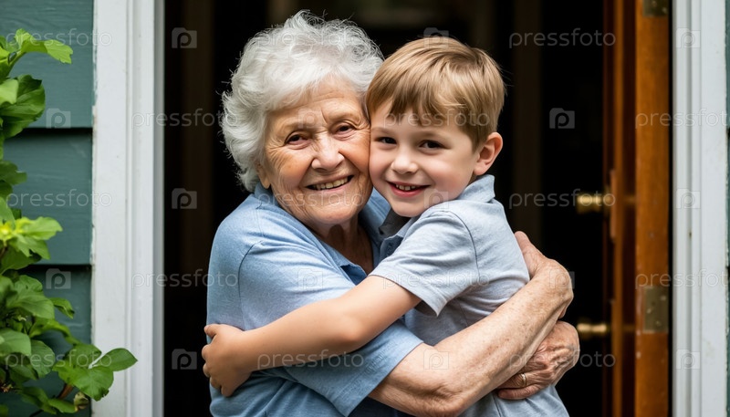 Бабушка обнимает внука на пороге. Сгенерированный ИИ