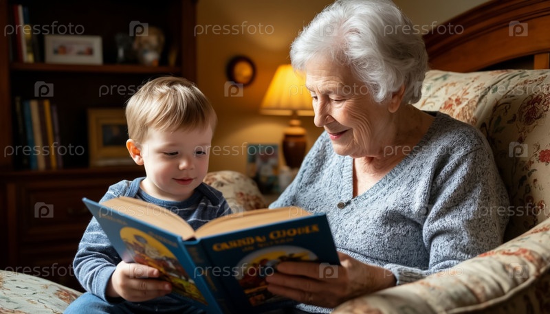 Бабушка читает внуку книгу на кровати. Генерируется ИИ