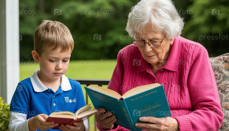 Бабушка читает внуку книгу на крыльце дома. Генерируется ИИ