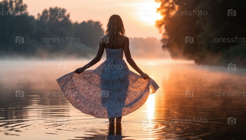 Девушка в легком платье заходит в реку на закате. Сгенерированный ИИ
