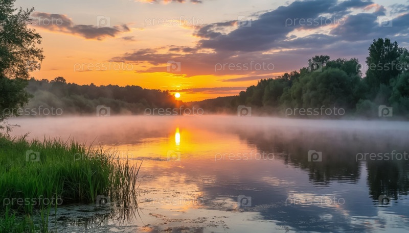 Прекрасный закат над рекой, летний пейзаж. Сгенерированный ИИ