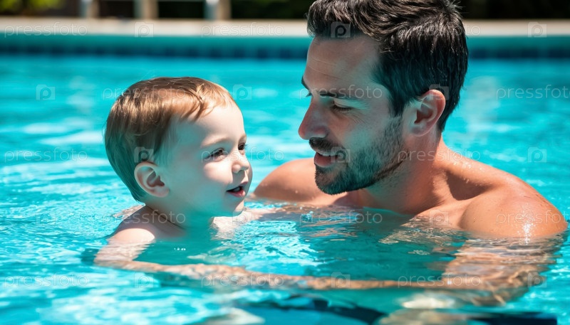 Отец учит своего маленького сына плавать в бассейне. Генерируется ИИ