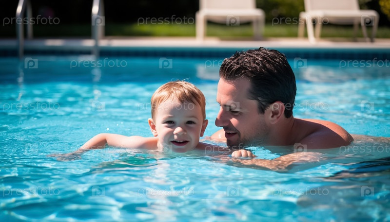 Отец учит своего маленького сына плавать в бассейне. Генерируется ИИ