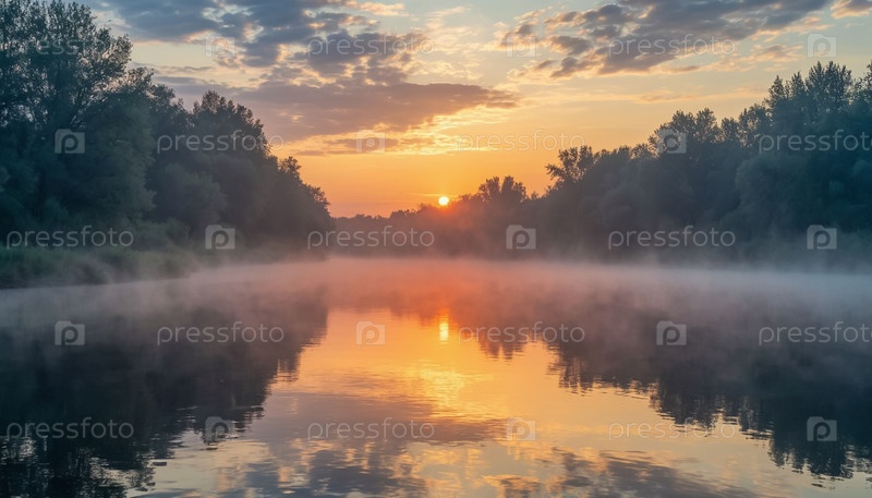 Прекрасный закат над рекой, летний пейзаж. Сгенерированный ИИ