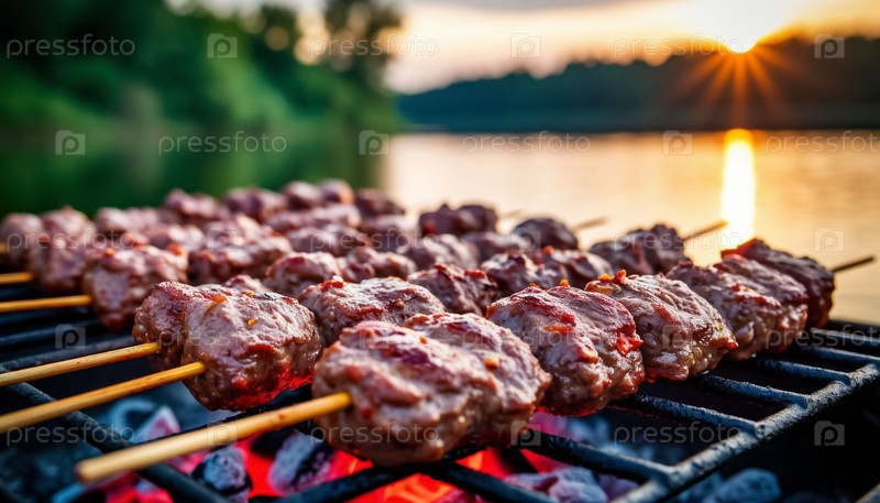 Шашлик на гриле на фоне реки и заката. Сгенерированный ИИ