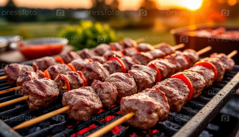 Закрытие шашлыка на закате в поле, летний пейзаж. Сгенерированный ИИ