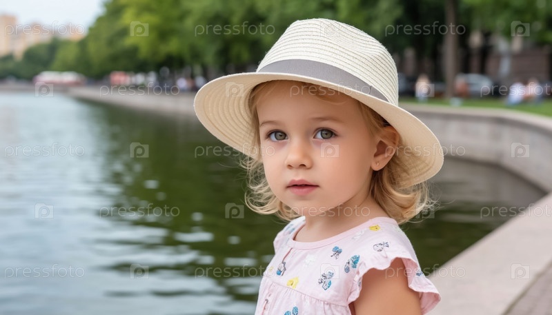 Ребенок в жаркий летний день в городском парке. Генерируется ИИ