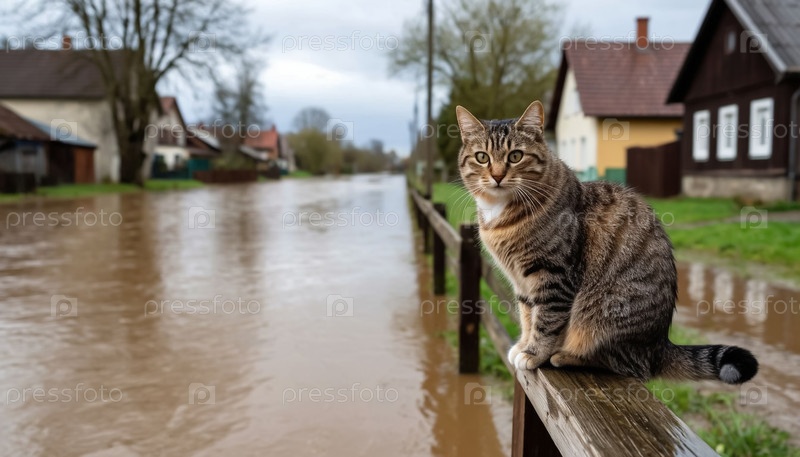 Кошка в затопленной пустой деревне. Сгенерированный ИИ