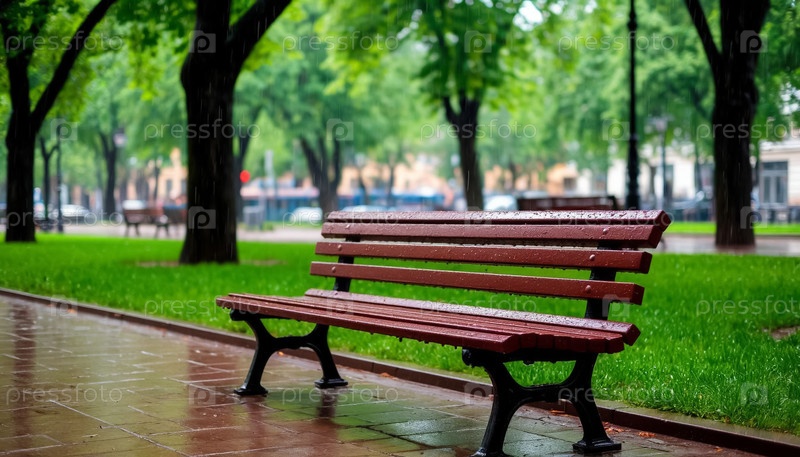 Осенний парк и скамейка во время дождя. Сгенерированный ИИ
